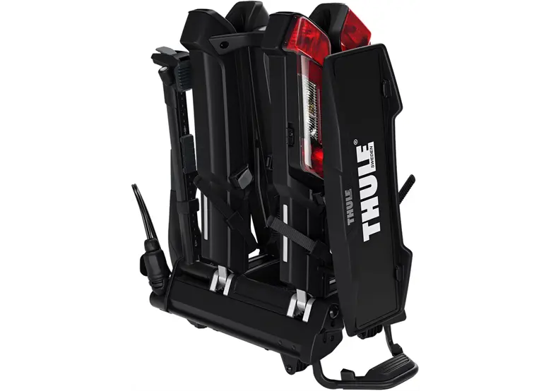 Bagażnik Thule Epos posiada funkcję odchylania, dzięki której można otworzyć tylną klapę samochodu nawet przy zamontowanych rowerach. Wystarczy nacisnąć pedał, aby platforma pochylała się do przodu.