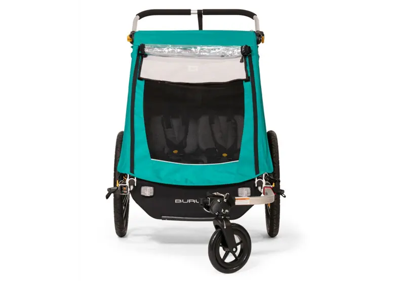 Przyciemniane boczne i tylne okna chronią dzieci przed promieniowaniem UV, a dodatkowa osłona przeciwsłoneczna sprawdzi się idealnie w słoneczne dni. Wodoodporna pokrywa zabezpiecza wnętrze przed deszczem, umożliwiając korzystanie z przyczepki niezależnie od pogody.