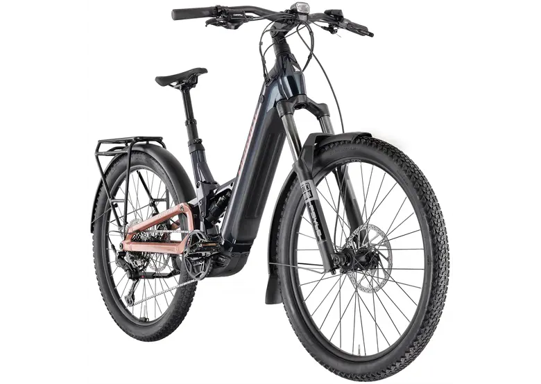 Rama aluminiowa o niskim przekroku i zintegrowanym akumulatorze zapewnia stabilność i ergonomię. Zawieszenie SR Suntour i RockShox wybiera nierówności, poprawiając przyczepność i komfort. Niska geometria umożliwia łatwe wsiadanie, a pełne zawieszenie oraz szerokie opony 27,5” gwarantują pewne prowadzenie zarówno w mieście, jak i w terenie.