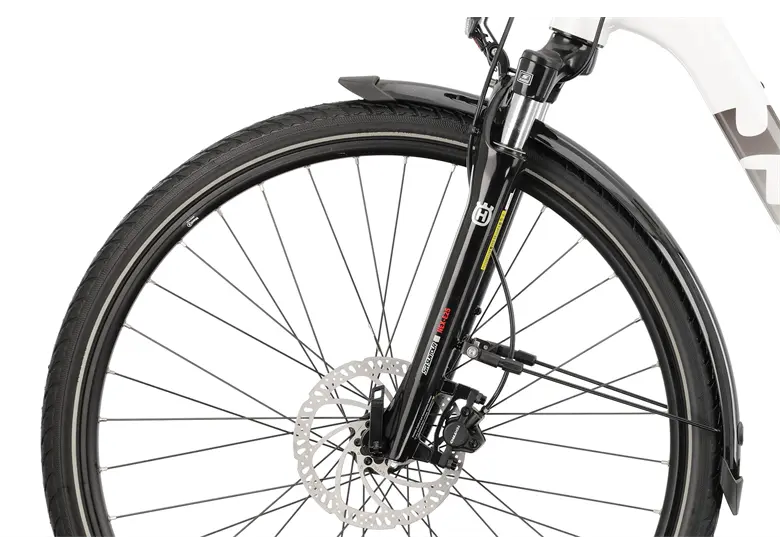 Amortyzowany widelec SR Suntour NEX-E25 o skoku 50 mm skutecznie tłumi nierówności, krawężniki oraz miejskie przeszkody, poprawiając komfort jazdy i zmniejszając zmęczenie podczas dłuższych tras.