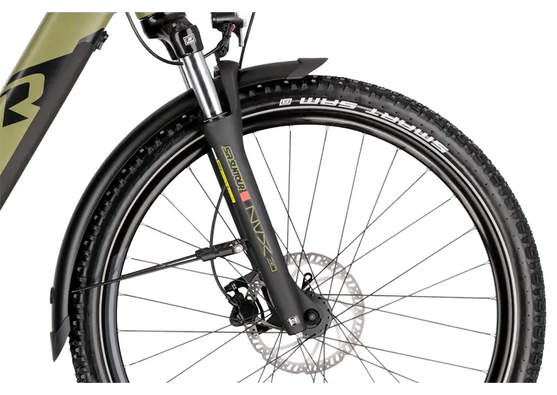 Model wyposażono w amortyzowany widelec SR Suntour XCM32 ATB DS Coil o skoku 80 mm. Dzięki temu widelec skutecznie tłumi nierówności, a jednocześnie poprawia kontrolę nad rowerem.
