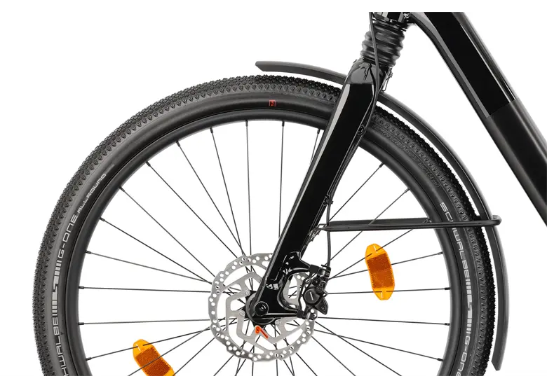 Widelec o skoku 45 mm skutecznie tłumi nierówności miejskich dróg i ścieżek rowerowych, poprawiając komfort na dłuższych dystansach.